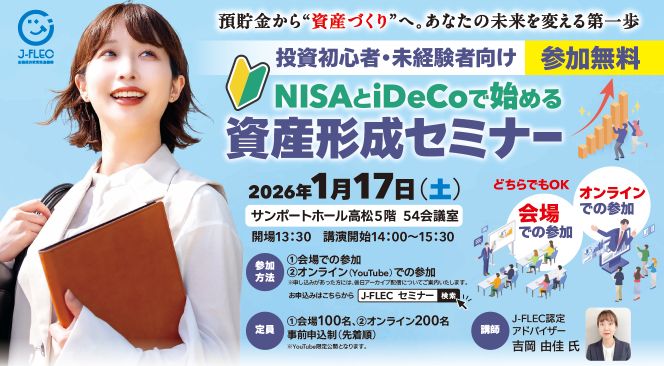 ご提供いただいた個人情報は、本セミナーの運営事務局である日本証券業協会の「個人情報保護宣言(プライバシーポリシー)」(https://www.jsda.or.jp/privacy/sengen.html)に沿って適切に取り扱い、本セミナーの運営・管理・アンケート調査及び今後のJ-FLEC主催イベントのご案内のために利用いたします。また、お知らせいただいた個人情報について、開示・訂正・削除・利用停止等をご希望される場合は、本協会のホームページをご覧のうえ請求手続きをしていただきますようお願いいたします。